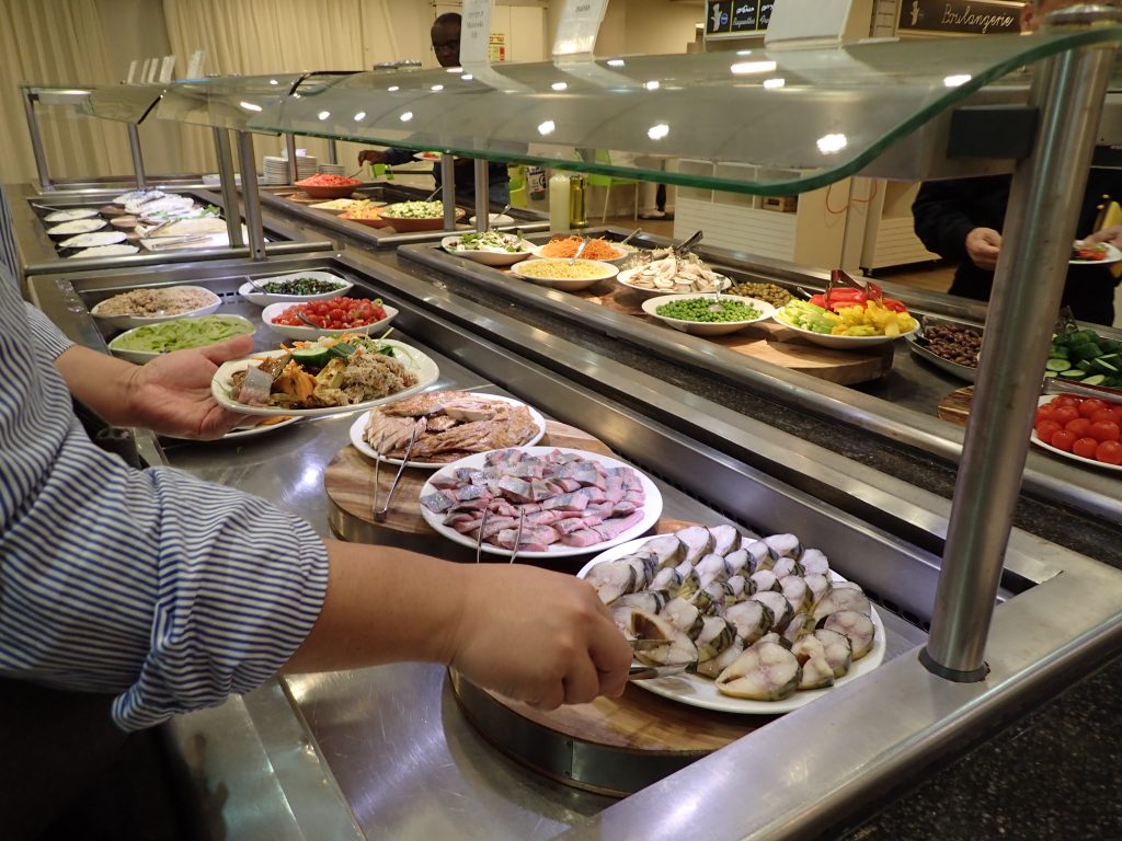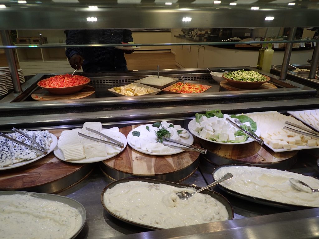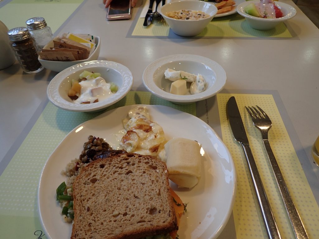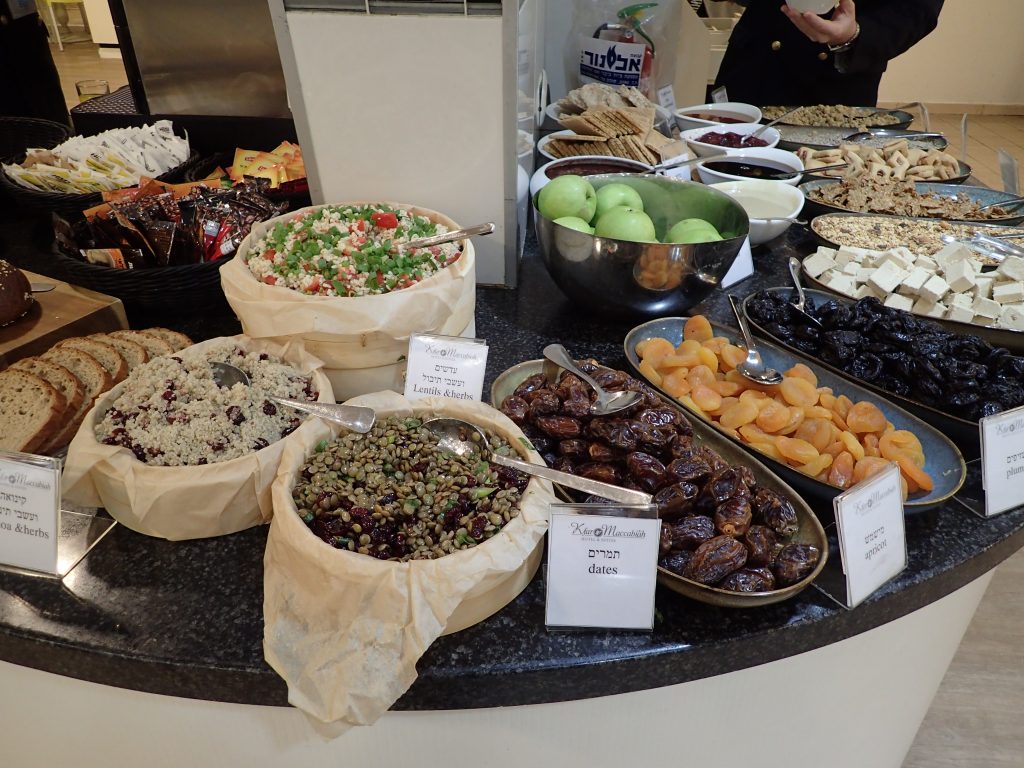 朝食はビュッフェ形式で、滞在中はホテルでの食事はぜんぶこのスタイル。イスラエルの朝食はパンとチーズとヨーグルト、それに野菜サラダと果物が多い。ただチーズの種類が豊富で、サラダも生野菜を細かく刻んだものや炒めたものなど種類が豊富。