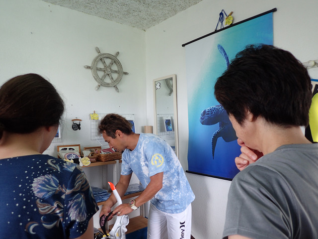 そこでマリンサービス海夢居の鈴木さんにお願いしてシュノーケリングとスクーバダイビングの基礎の修得をプログラムの中に組み込んでいるわけです。