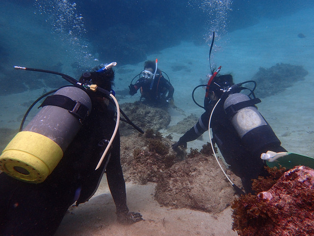 人生初のスキューバダイビングダイビング。そっと海底で心を落ち着けて呼吸しながら魚を眺めます。不思議なことにだんだん魚が寄って来るんです