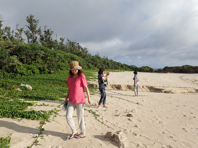 朝のビーチの散策。グンバイヒルガオが群生しています