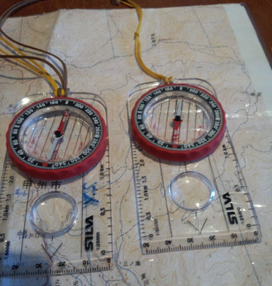 国土地理院の20000分の1の山地図とシルバのコンパスを片手に実際の地形を見ながらコンパスを使いこなす練習満載(笑。