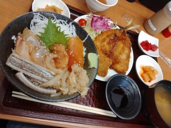 松輪の人気店「ぼーめん」の定食。漬け丼とアジとスズキのフライ定食はコスパがいい。